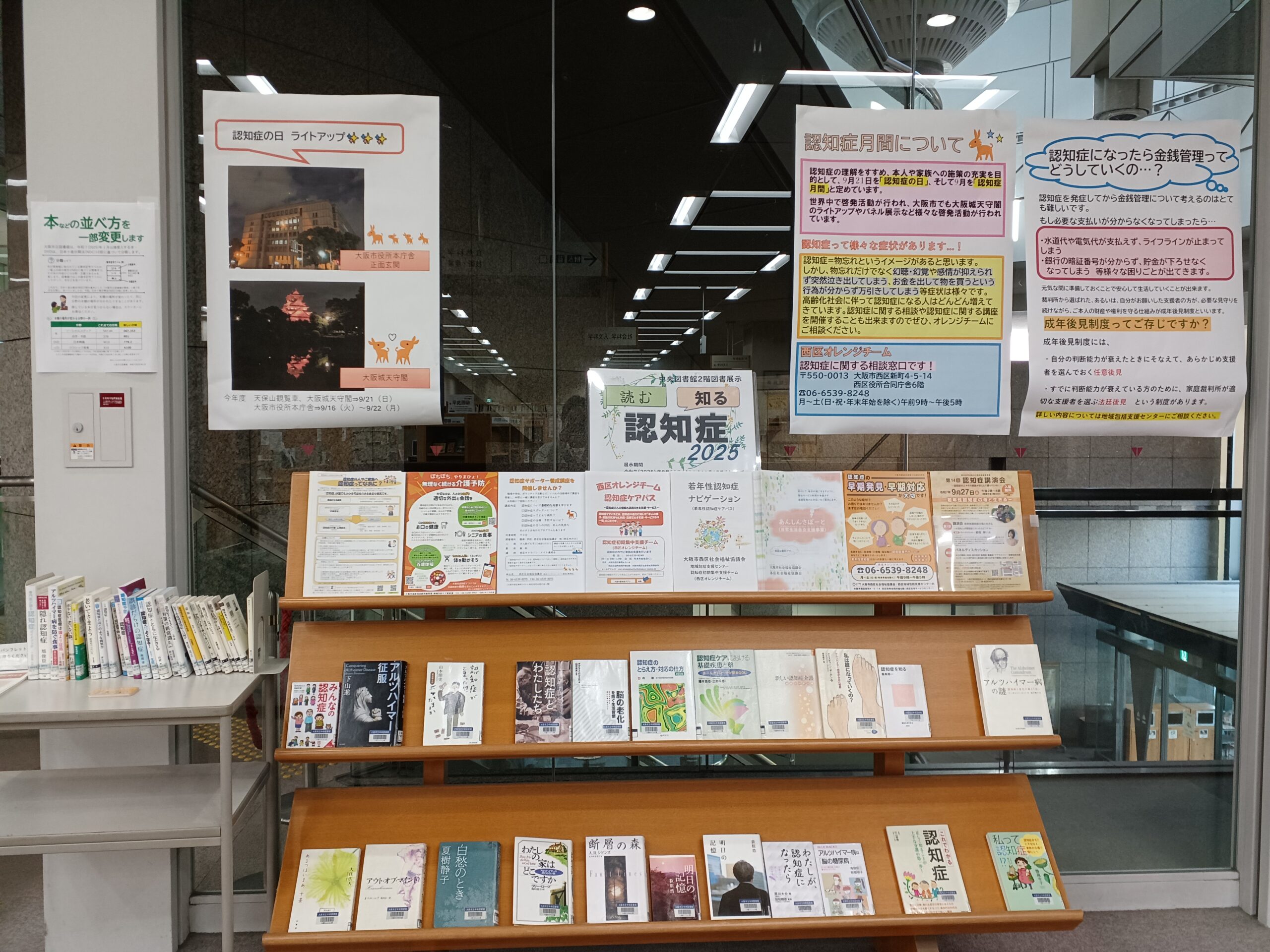 認知症の啓発活動を行うため様々なところで啓発活動がされていますが、西区にある大阪市立中央図書館でも認知症に関する本やチラシ、ポスターの展示が始まっています!